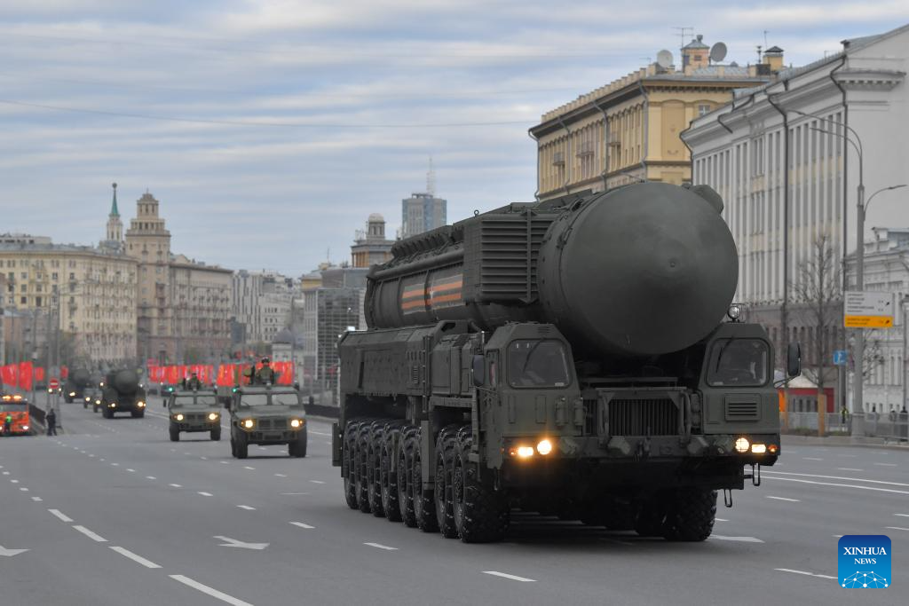 A russian missile launcher drives along a street to attend a rehearsal for the victory day military parade in moscow, russia, on may 2, 2024. President vladimir putin has told moscow’s victory day parade that the world is at a turning point, with a real war being waged against russia.